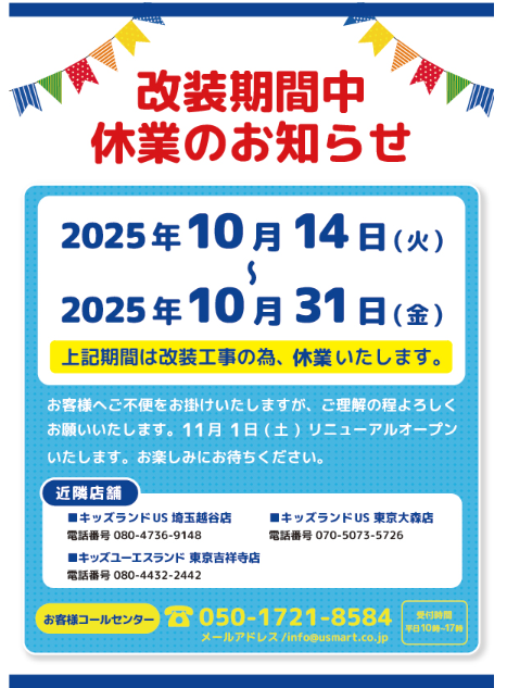 浅草エキミセ「キッズユーエスランド」改装期間休業のお知らせ