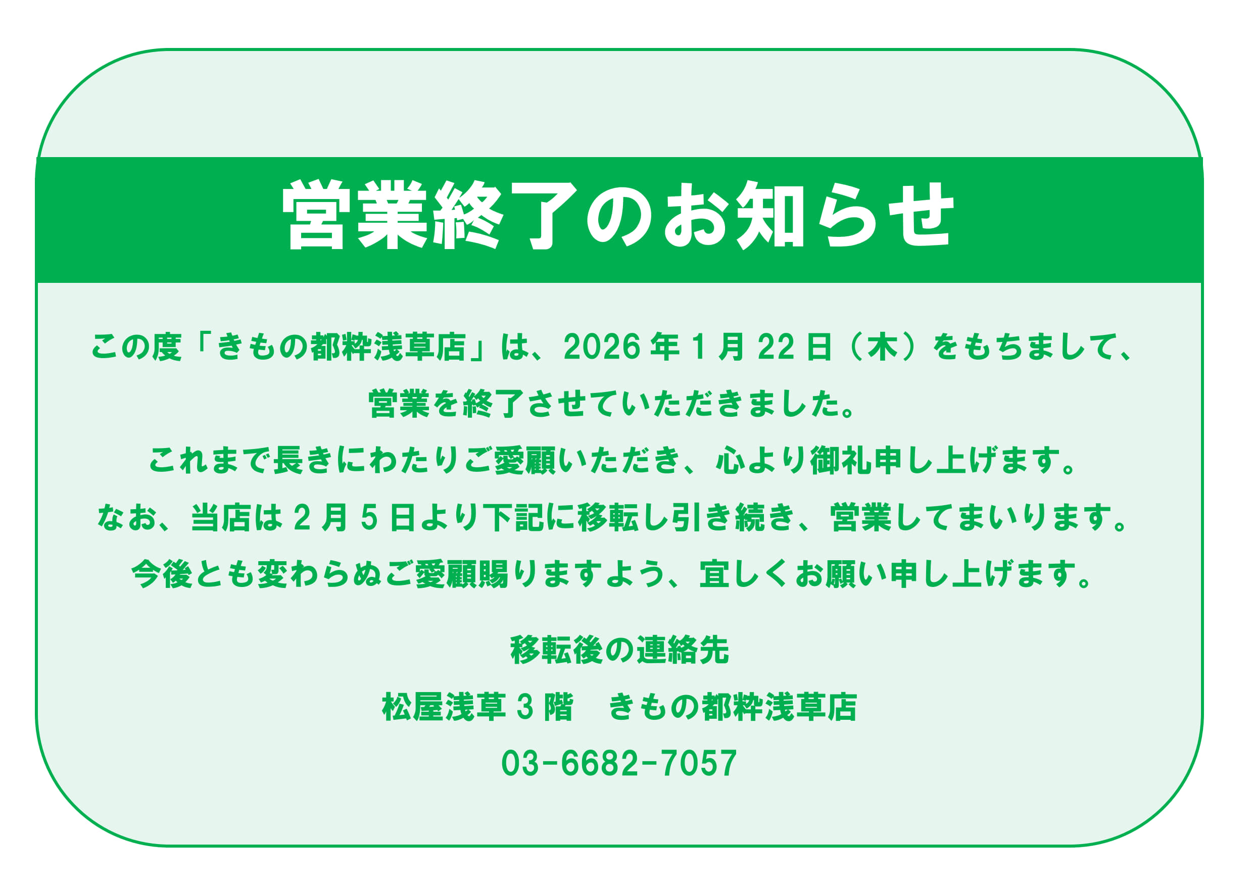 お知らせ 2026年1月27日 4Fきもの都粋・room&room閉店のおしらせ 平素はEKIMISEをご愛顧いただきまして、 誠にありがとうございます。 この度、4F「きもの都粋」は1月22日「room&room」は1月26日を もちまして閉店いたしました。 長年ご愛顧いただきまして、誠にありがとうございました。