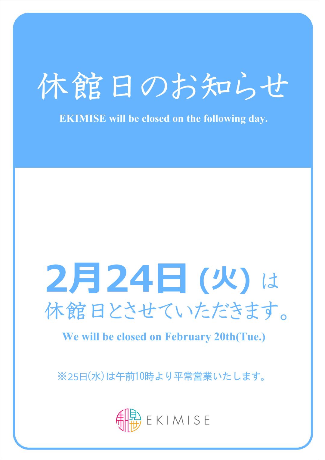 お知らせ 2026年2月2日 【2月24日(火)】休館日のお知らせ 日頃より浅草エキミセをご利用いただきまして、誠にありがとうございます。 誠に勝手ながら、 2月24日(火)は 休館日とさせていただきます。 お客様にはご不便をおかけいたしますが、ご理解ご協力の程よろしくお願いいたします。