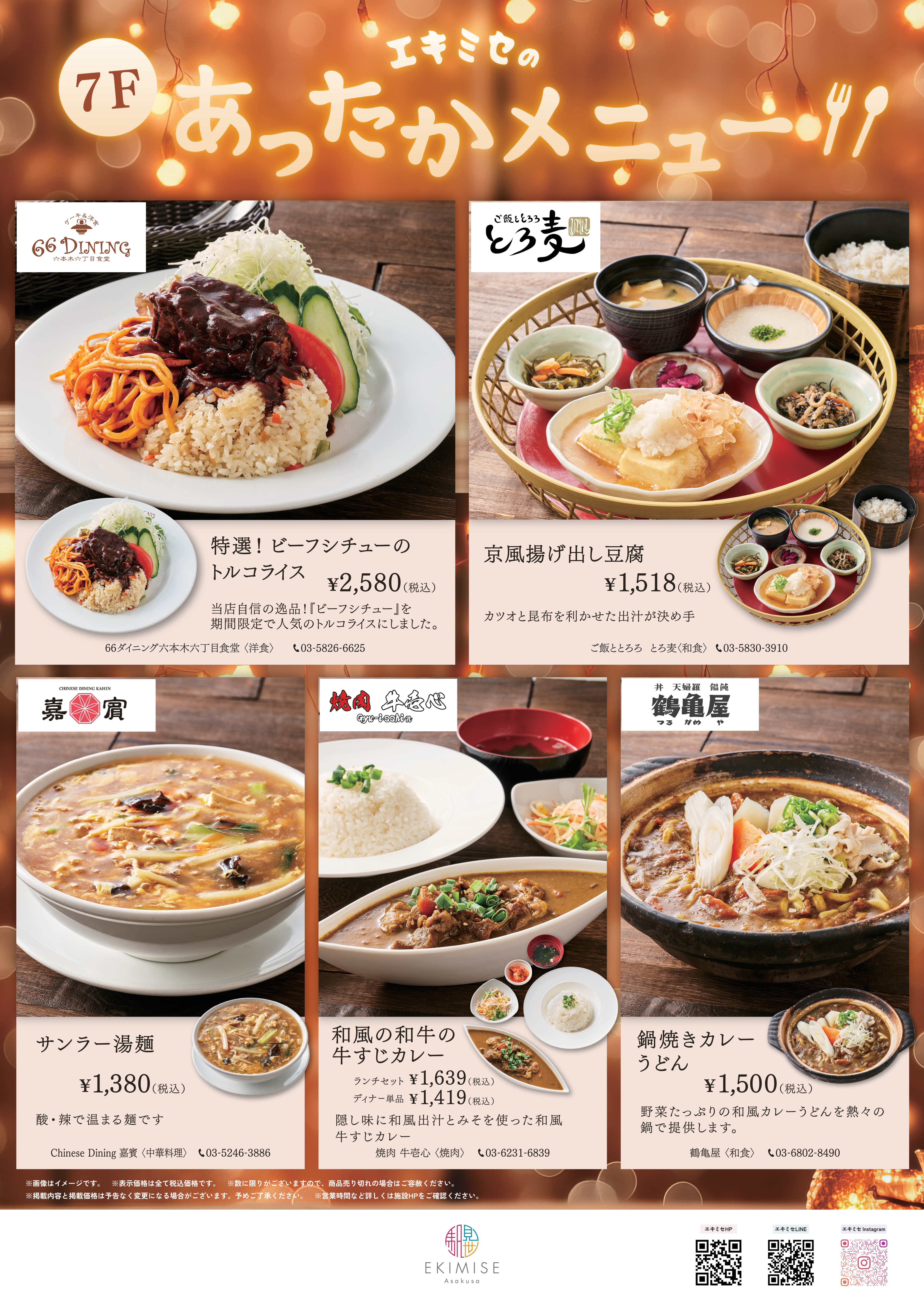 キャンペーン 2025年11月1日 7F レストラン 冬のあったかメニュー 7階レストランフロアでは 冬のあったかメニューがスタート! 寒い季節に心も体も温まる「あったかメニュー」が登場しました。 この季節だけの味わいをお楽しみください