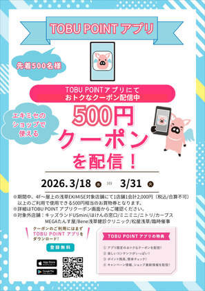 TOBUポイントアプリでは、1会計2,000円以上のご利用で使用できる500円相当のクーポンを配信中!